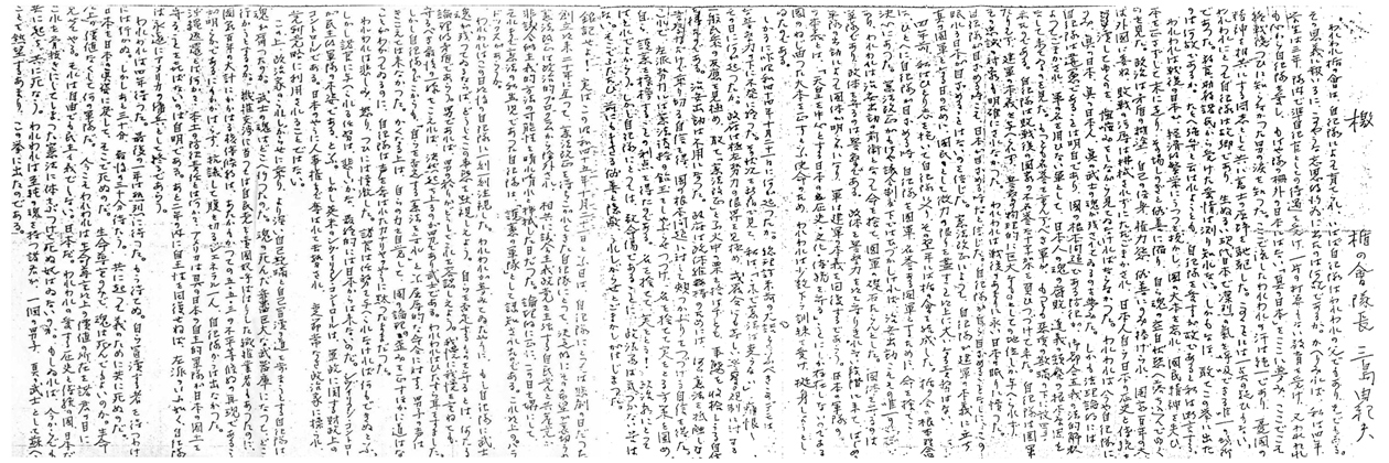 四年前、私はひとり志を抱いて自衛隊に入り、その翌年には楯の会を結成した。楯の会の根本理念は、ひとへに自衛隊が目ざめる時、自衛隊を國軍、名誉ある國軍とするために、命を捨てようといふ決心にあった。憲法改正が、もはや議会制度下ではむずかしければ、治安出動こそその唯一の好機であり、われわれは治安出動の前衛となつて命を捨て、國軍の礎石たらんとした。國體を守るのは軍隊であり、政體を守るのは警察である。政體を警察力を以て守りきれない段階に来て、はじめて軍隊の出動によつて國體が明らかになり、軍は建軍の本義を回復するであらう。日本の軍隊の建軍の本義とは「天皇を中心とする日本の歴史.伝統.文化を守る」ことにしか存在しないのである。國のねぢ曲がつた大本を正すといふ使命のため、われわれは少数乍ら訓練を受け、挺身しようとしてゐたのである。