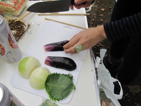 その間に料理長が早速胡瓜で摘みを作る。「美味いじやん」。さてと、野菜焼くか。肉ばかり食つてると痛風くらいまつせ。