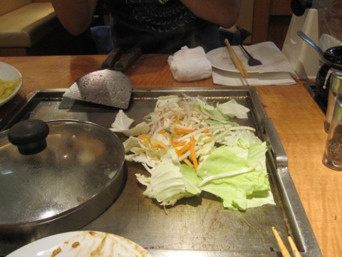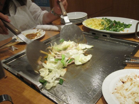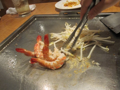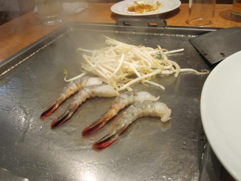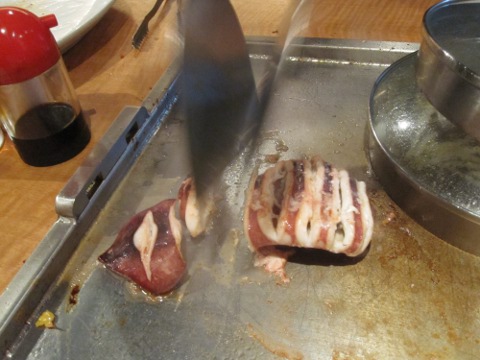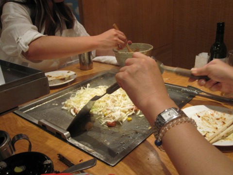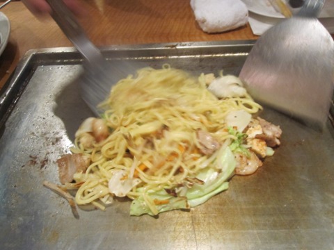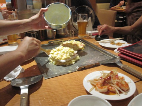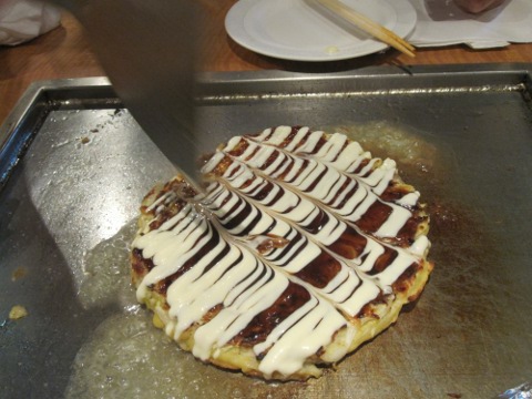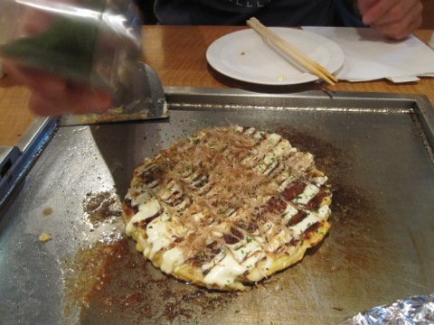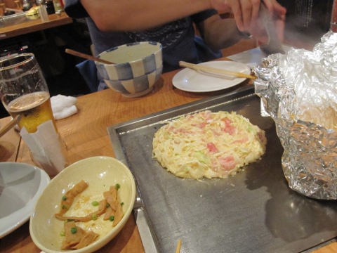 昼の部は暑かつたから、麦酒は勿論一気飲み。さて、ここからは統括の独壇場。見事なヘラ捌きで焼いてくれる。流石はプロだねえ。