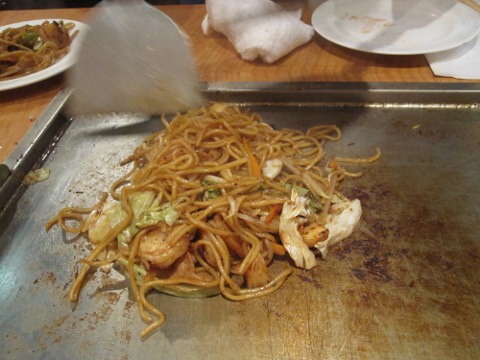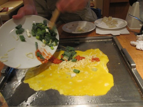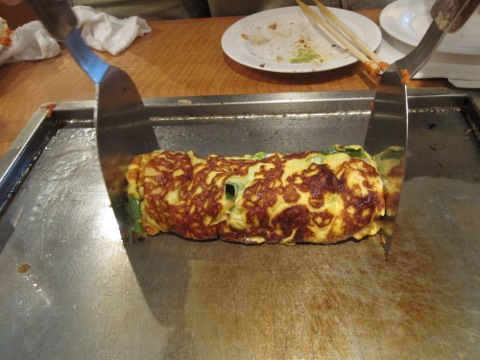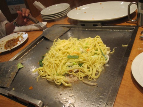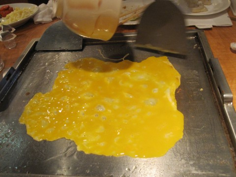 いよいよシヨー・タイム。統括特製卵焼き。つうか、オムレツ。美味しひねえ。ついでに焼そばも焼いてよ。昼はすき焼で、夜はお好み焼じやあカロリー摂り過ぎか。