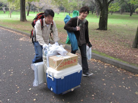 小金井公園で武蔵野けつたくり團の初BBQ。御幸町から台車と婆チヤリで荷物を運ぶ。